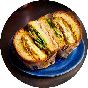 Pain brioché, jambon cuit supérieur, brouillade d’oeufs, cheddar maturé, sauce yaourt-ciboulette.