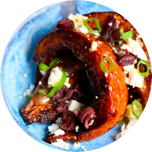 Pain brioché, aubergine rôtie, fenouil, fêta, pousses d’épinard, pignons, citron confit, sauce romesco.