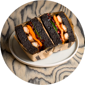 Pain de mie shokupan à l’encre de seiche, poisson (selon arrivage) pané panko, concombre, fenouil, pousses d’épinard, sauce mayonnaise tartare.