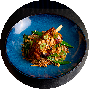 Soba (nouilles de sarrasin), brochette de poulet saté, carottes, chou blanc, céleri branche, edamames, oignons frits, cacahuètes, menthe, coriandre.